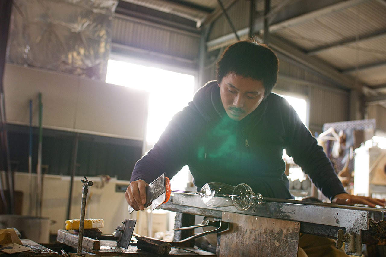 ボディの口周りの厚さやステムの細さも、とてもシビアな数値基準があって、そこに合わせるのがとても難しいです。柔らかいガラスでないと作れないのですが、油断するとガラスに遊ばれちゃう。しかも、吹くのもステムを引くのも自分なので、それを工程のなかで上手く切り替えしなければならないので、本当に集中しないと作れないです。