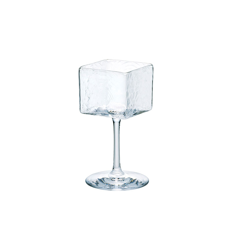 ワイングラスのように脚の付いた枡酒をイメージしたグラスです。お祝いの席の枡酒をよりスタイリッシュに飲めるようにと、このカップ部分は一合枡の内寸から寸法を取って、すりきりで一合(180ml)入るようにデザインしています。