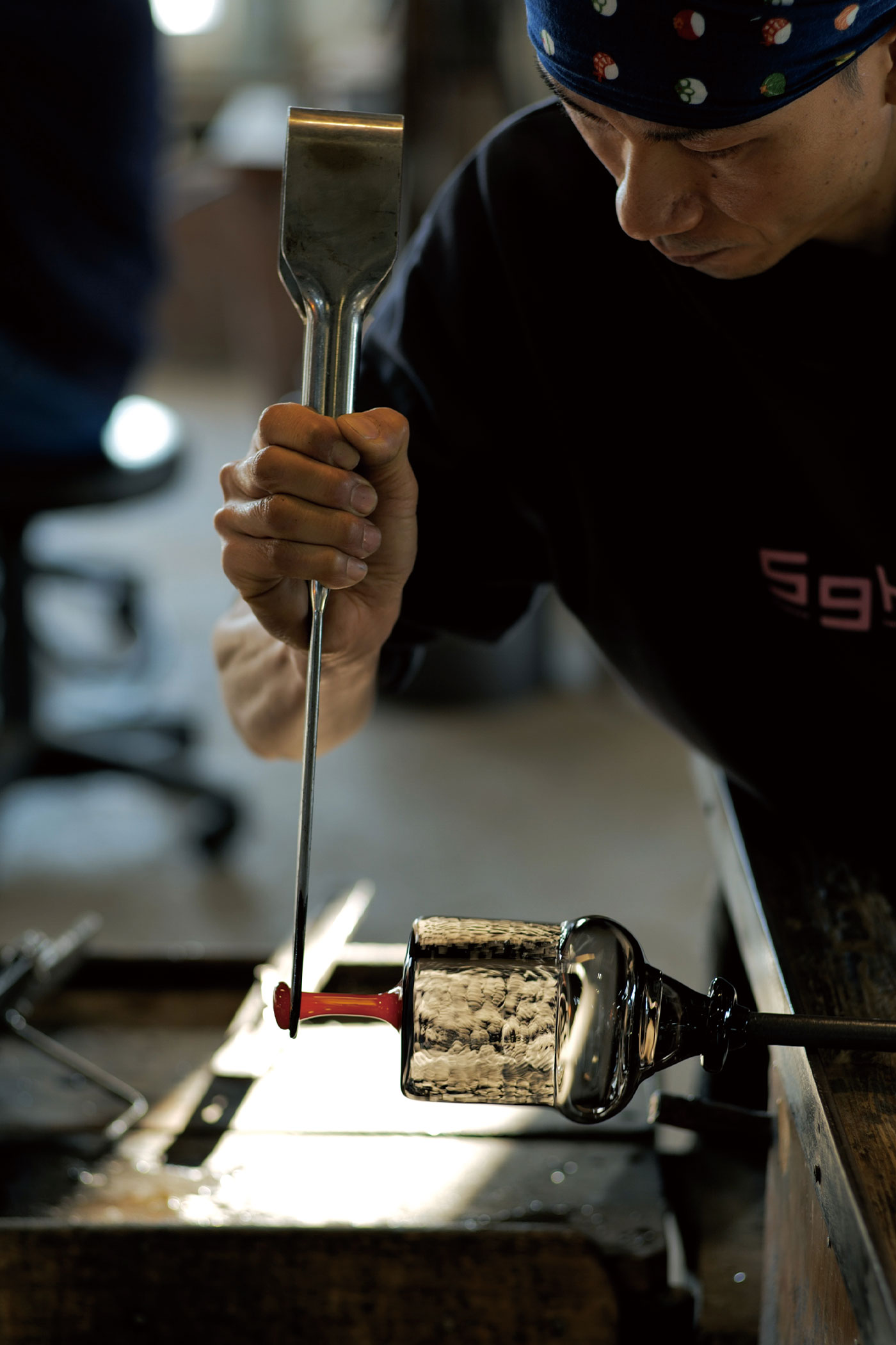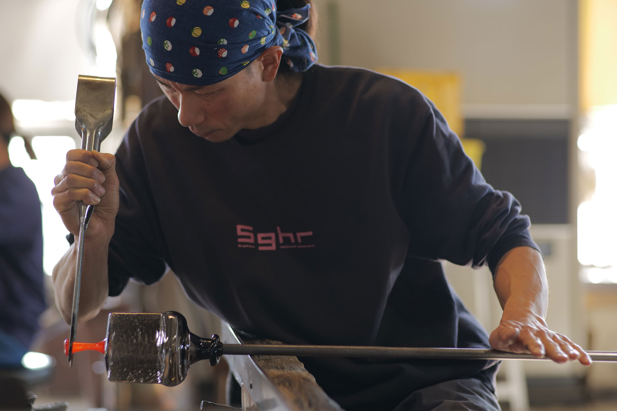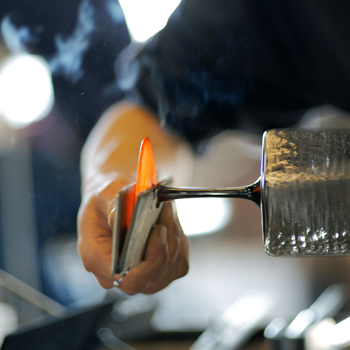 今回は脚付きをやりたかったというのが一つ。脚付きというとワイングラスがメインですが、そうじゃない日本酒のグラスを作りたくて考えました。日本酒のおちょこやぐい呑は背が低いものが多いですが、テーブルに置いた時にスタイリッシュな背が高いものを作りたかったのがきっかけです。