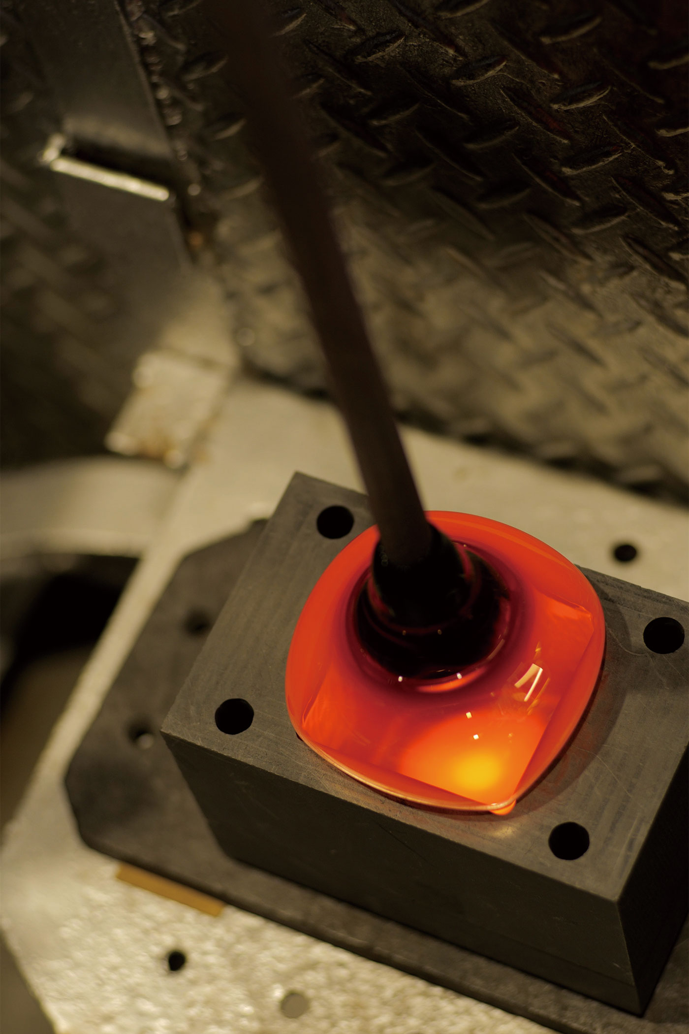 カップと脚を一体で吹く引き足という技法で作っています。つなぎ目が滑らかになりますが、この製品は底面が真っ平らで広いため、足を引く時に道具(ハシ)を寝かせることができない。先端が底に当たってしまうので、そこを気にしつつ滑らかに引くのがとても難しく、当初苦戦しました。