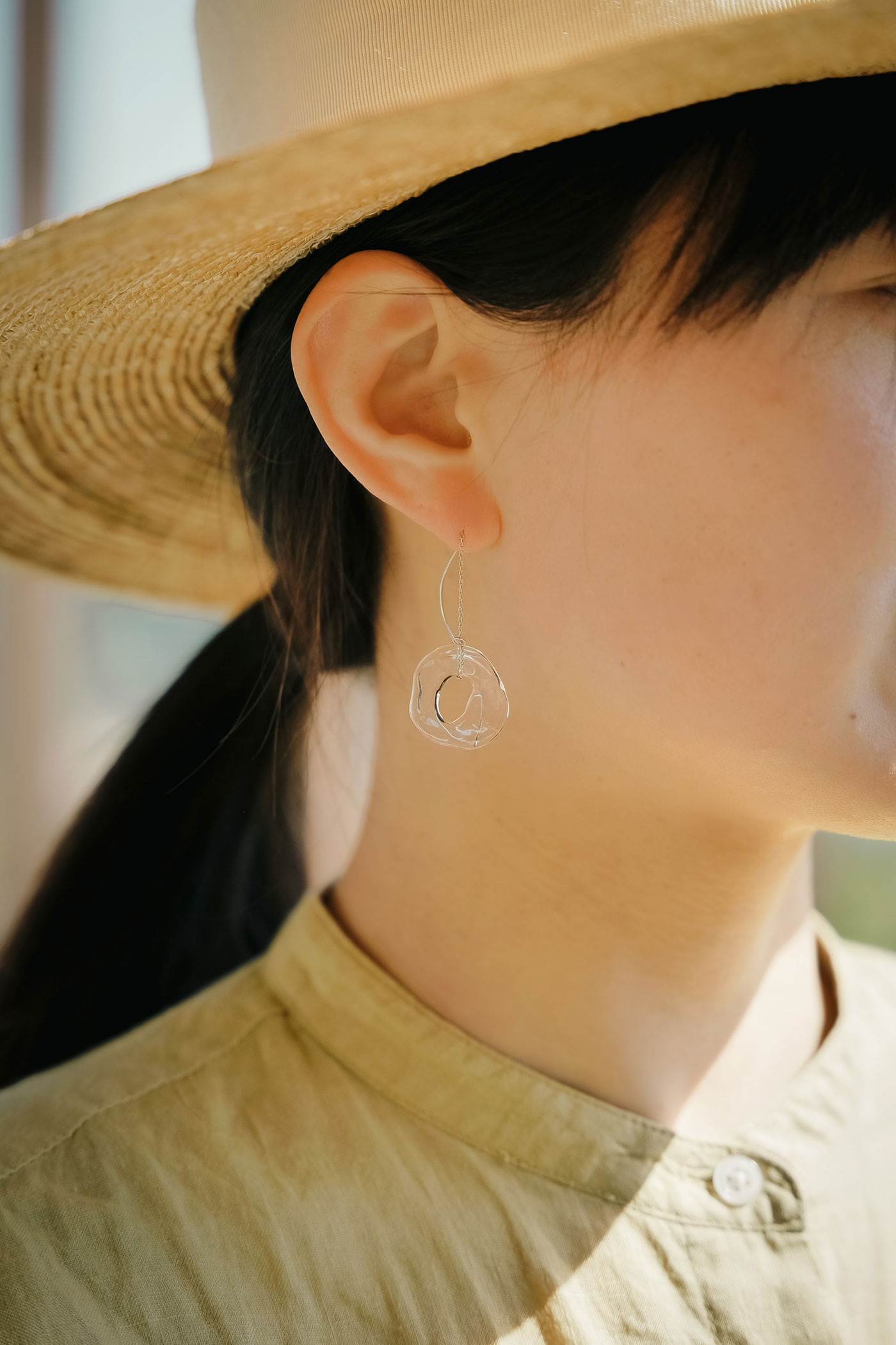 降り注ぐ陽射しに、水面がきらきらと揺らめく表情を形にしたアクセサリーです。光に反射して輝くガラスが、ゆらゆら揺れる様子をお楽しみください。