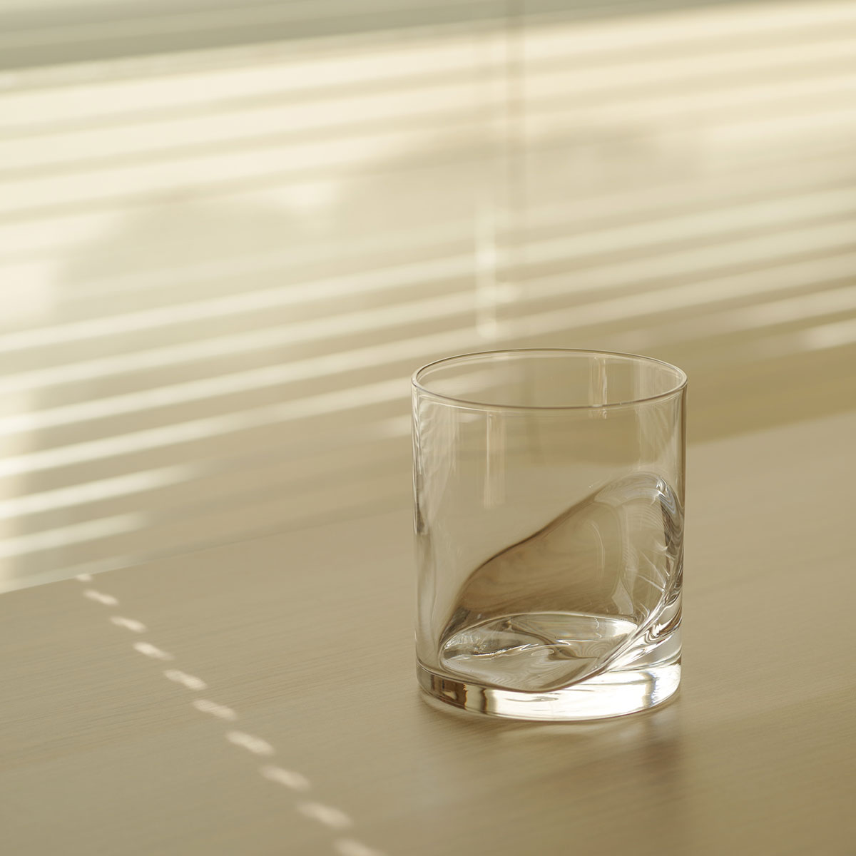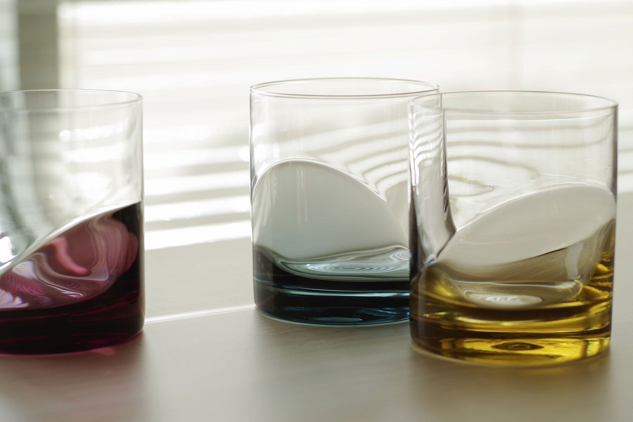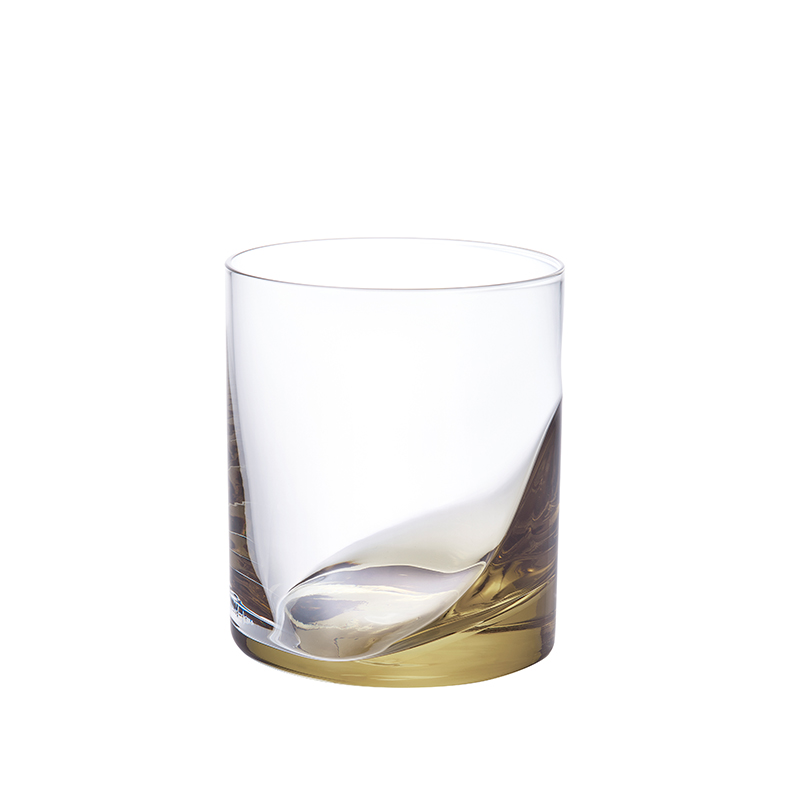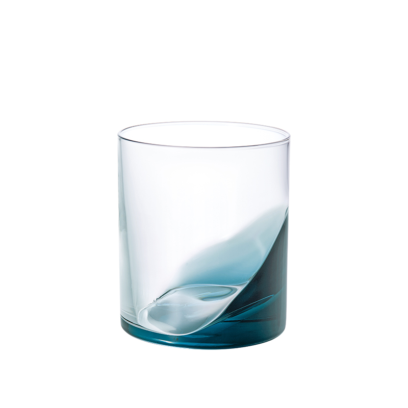 出口:私はストレートでパキッとした、シンプルなグラスが好きなんです。まずラフなデザイン案を出して、そこから製造の安定性や使い勝手を考えて、大先輩の塚本さんに相談しながら、凹凸の出し方やラインを試行錯誤して製品になりました。底から斜めにうねって上がるような有機的な曲線が私が見せたいポイントで、当時カタログ写真でもそれがしっかりと表現されていて嬉しかったのを覚えています。水や炭酸など透明なものを入れると、その溜まった部分に色が映り込んで動きが出るんです。入っている時といない時の差を楽しんでほしいですね。