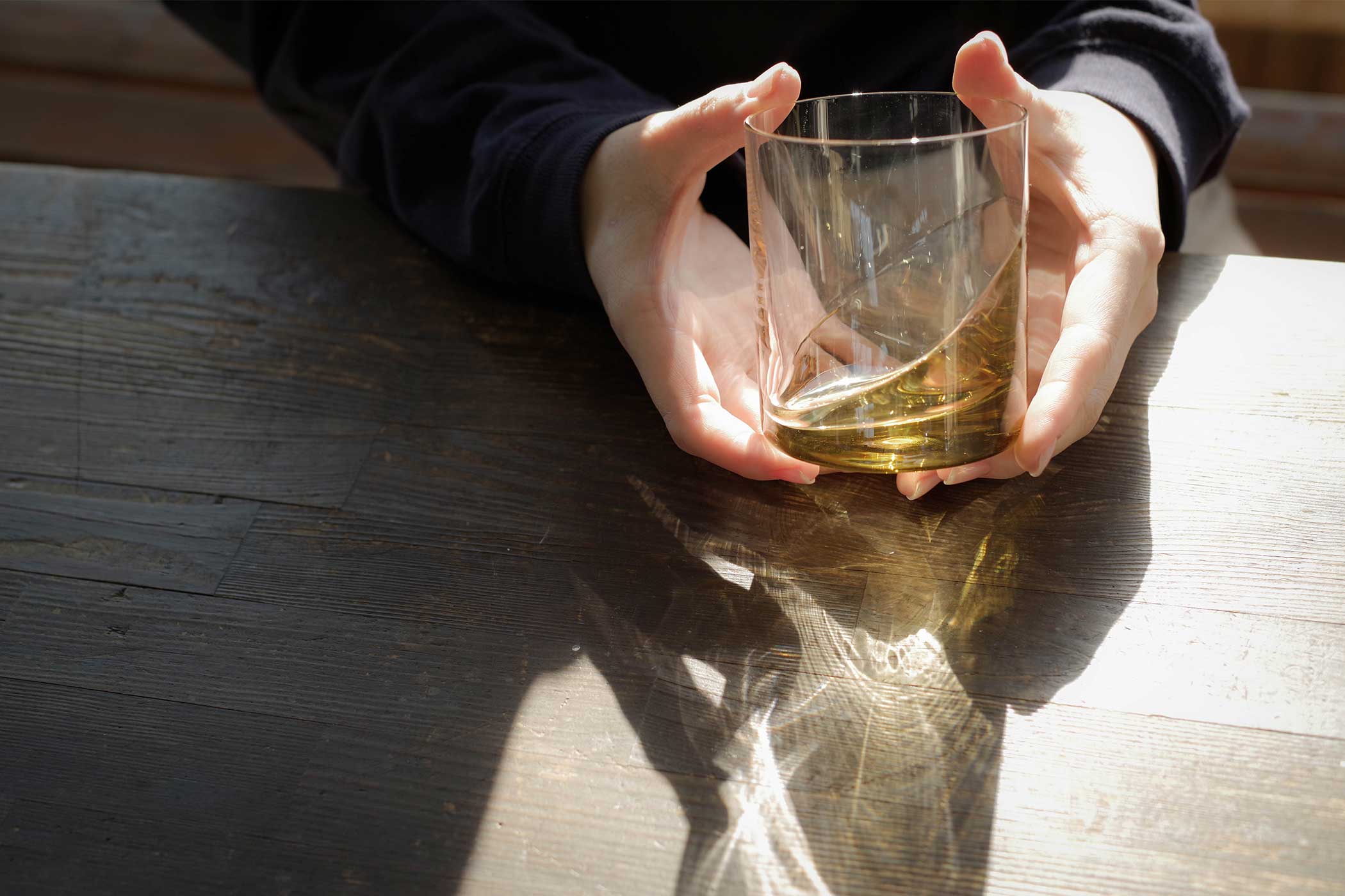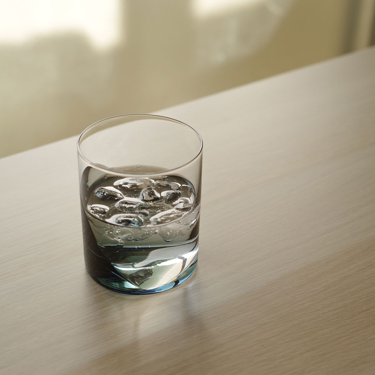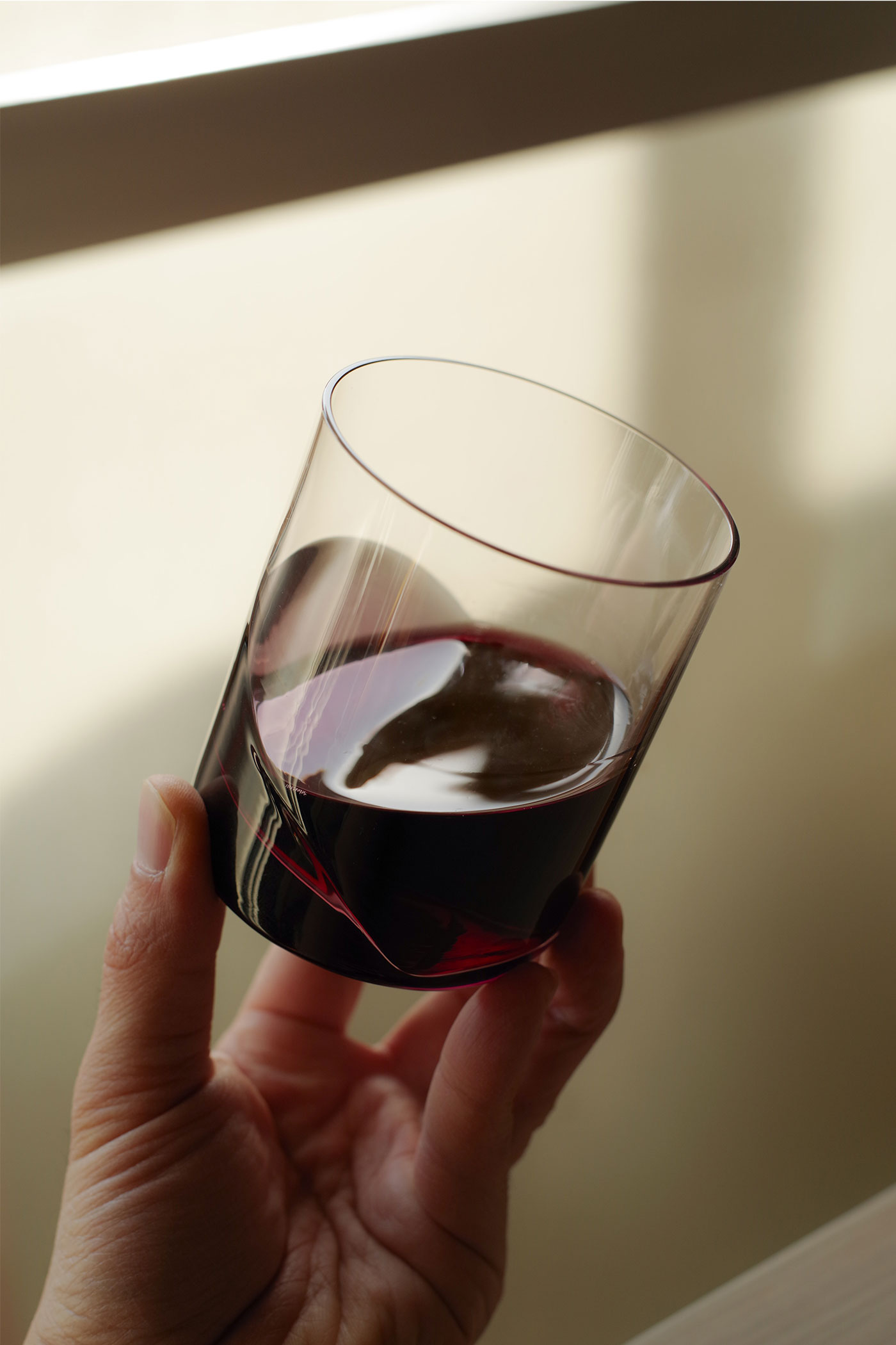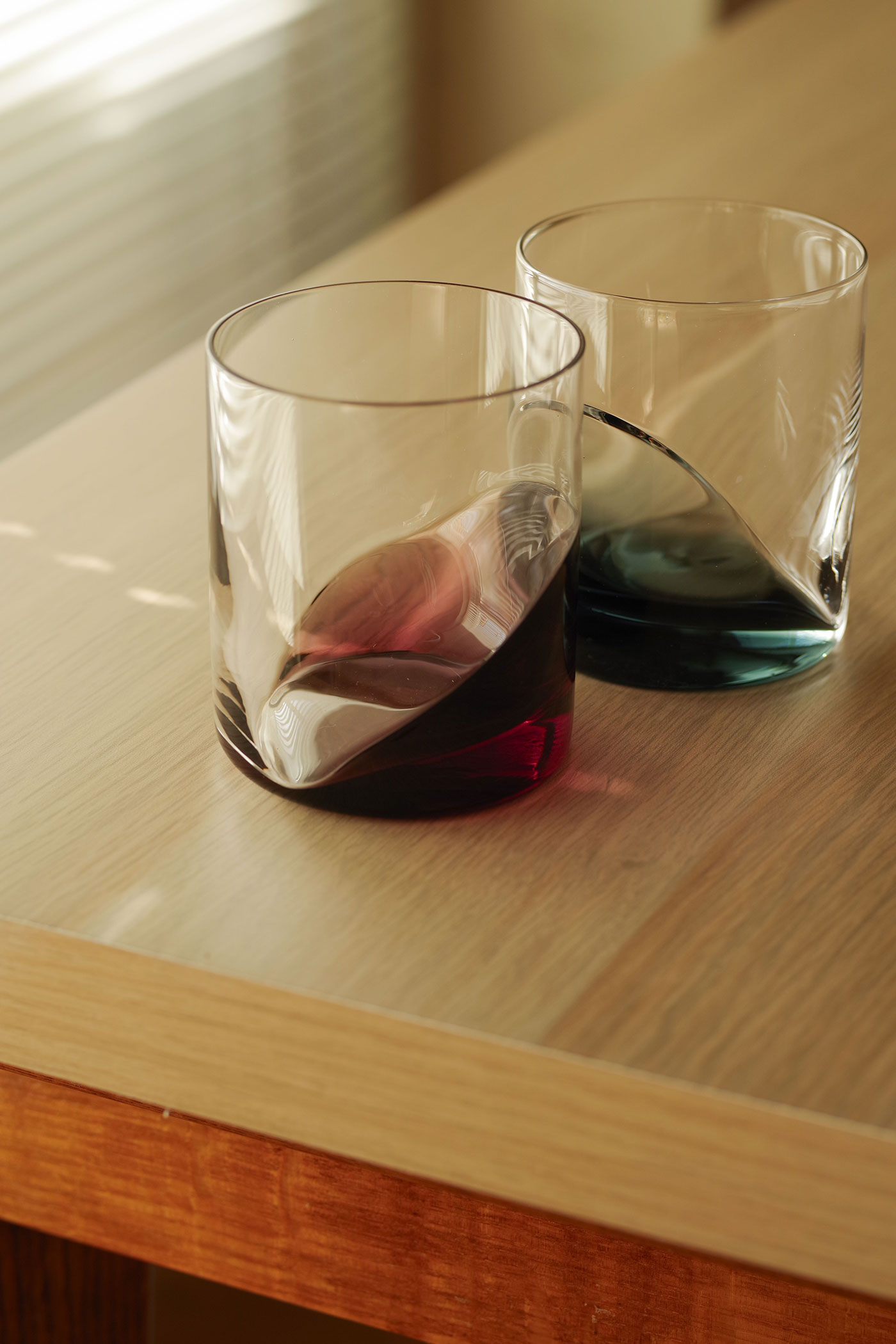 出口:私はストレートでパキッとした、シンプルなグラスが好きなんです。まずラフなデザイン案を出して、そこから製造の安定性や使い勝手を考えて、大先輩の塚本さんに相談しながら、凹凸の出し方やラインを試行錯誤して製品になりました。底から斜めにうねって上がるような有機的な曲線が私が見せたいポイントで、当時カタログ写真でもそれがしっかりと表現されていて嬉しかったのを覚えています。水や炭酸など透明なものを入れると、その溜まった部分に色が映り込んで動きが出るんです。入っている時といない時の差を楽しんでほしいですね。