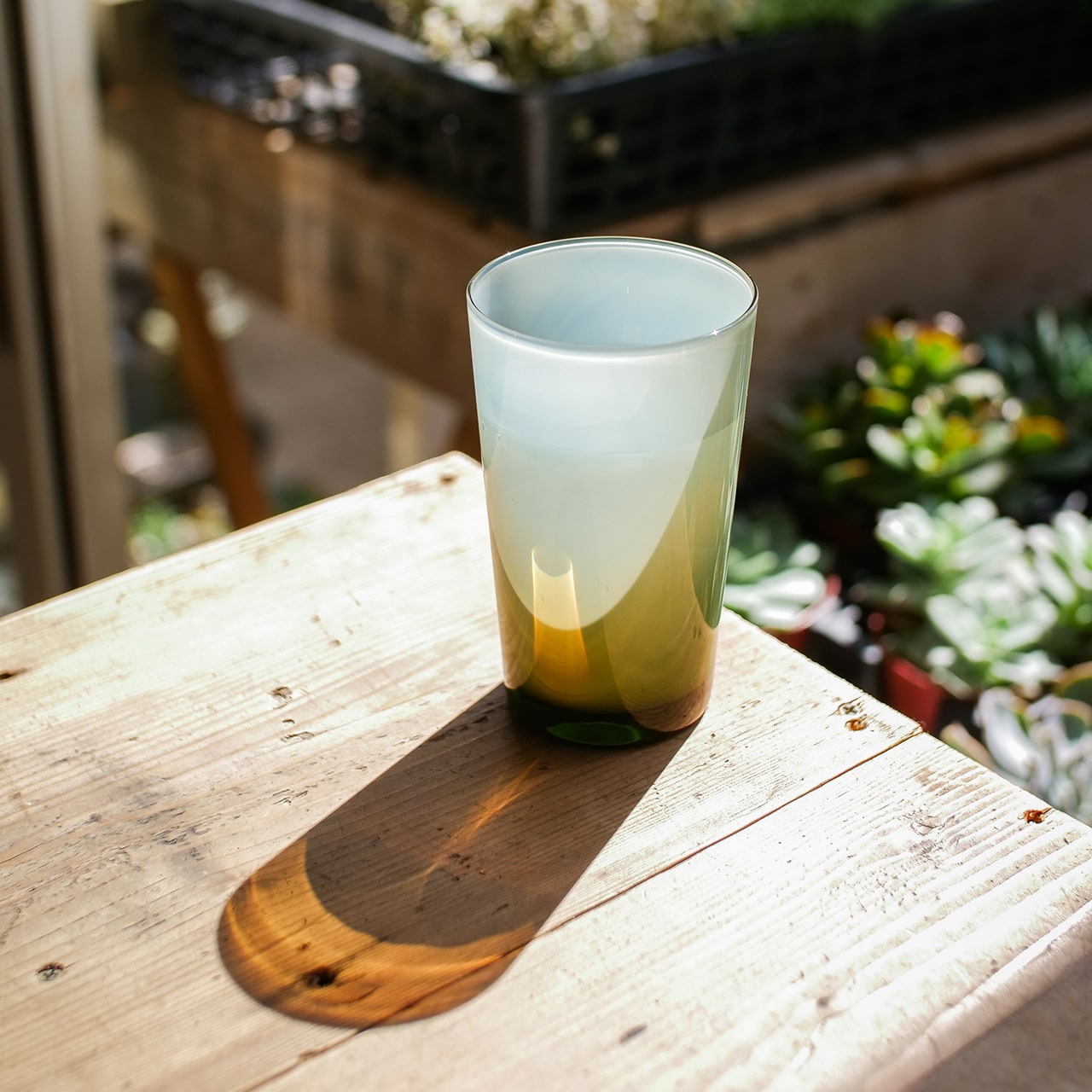「ビールが好きなので、サイズ感がちょうど良いですよね。色ごとに付けられた名前も良くて、朝霧というこの半透明なインディゴも好きです。いつも植物のことが頭にあるからか、やはり緑や青を選んでしまいますね。自分が暮らしの中で気がかりにならないもの、心地良いものを身の回りには置きたいんです」