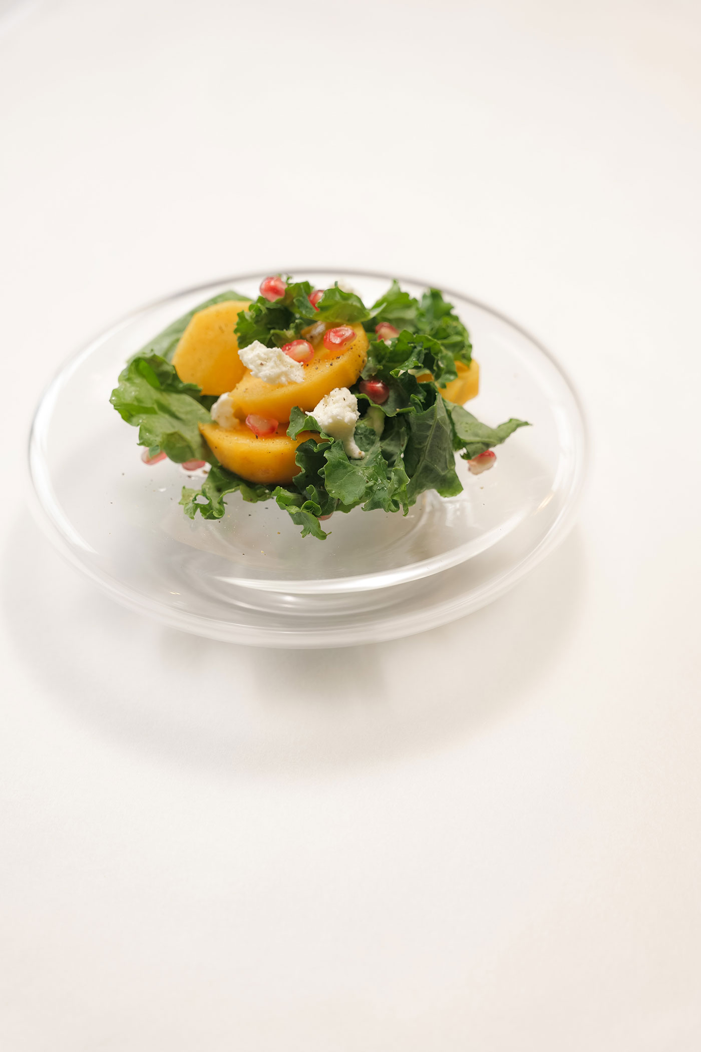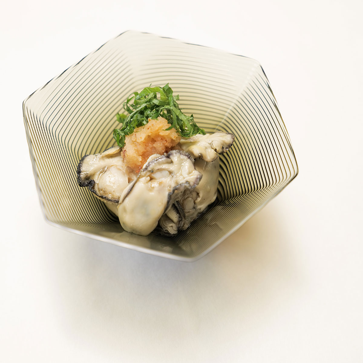 秋、柿の実がなっている光景を見ると季節のなかにいることを実感します。同じく旬のざくろ、チーズと合わせてサラダにして旬を味わいます。そして牡蠣もまた晩秋から旬を迎え、ふっくらとした身に濃厚な味わいをさっぱりとしたポン酢と秋らしい紅葉おろしを添えて、シンプルにいただきます。