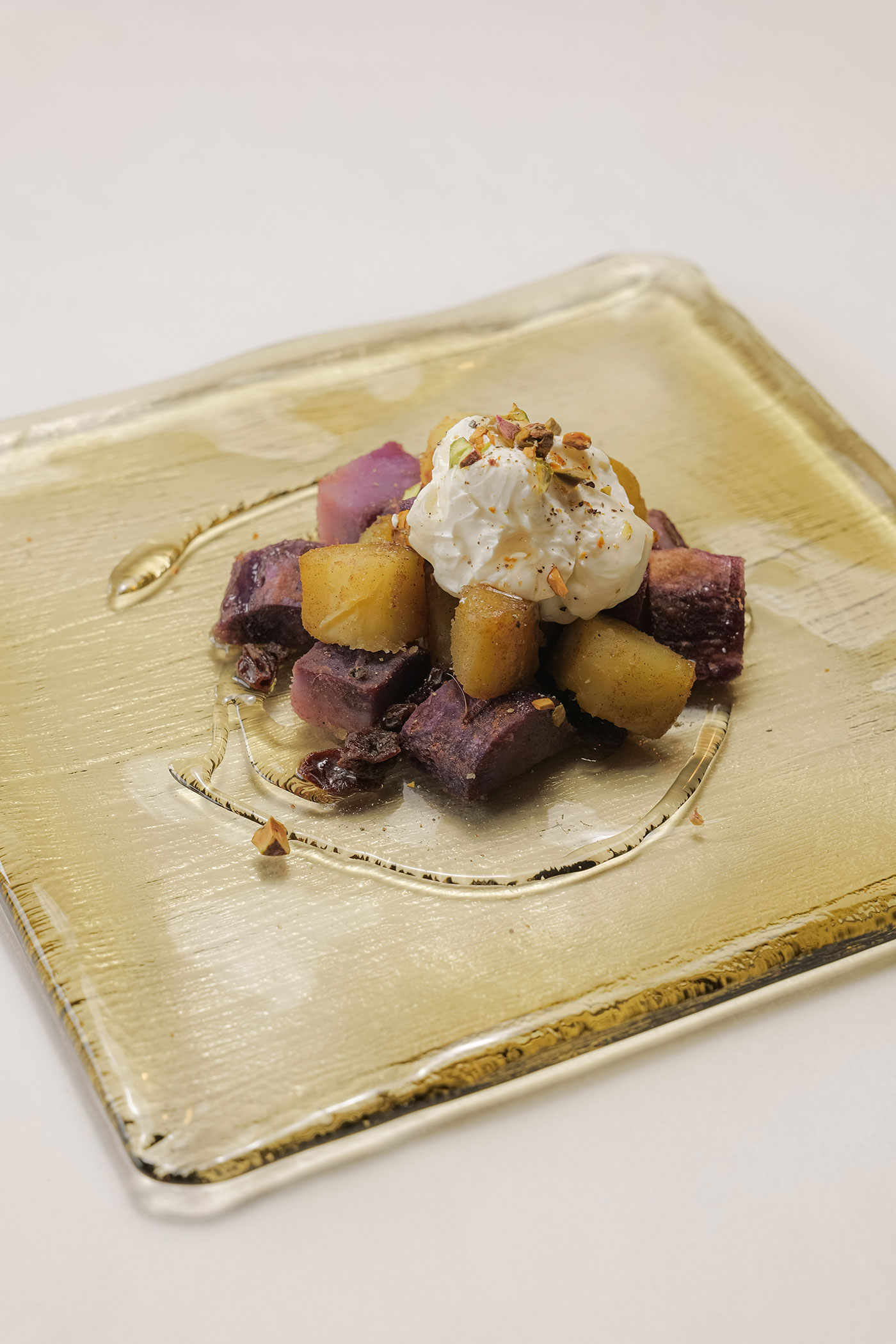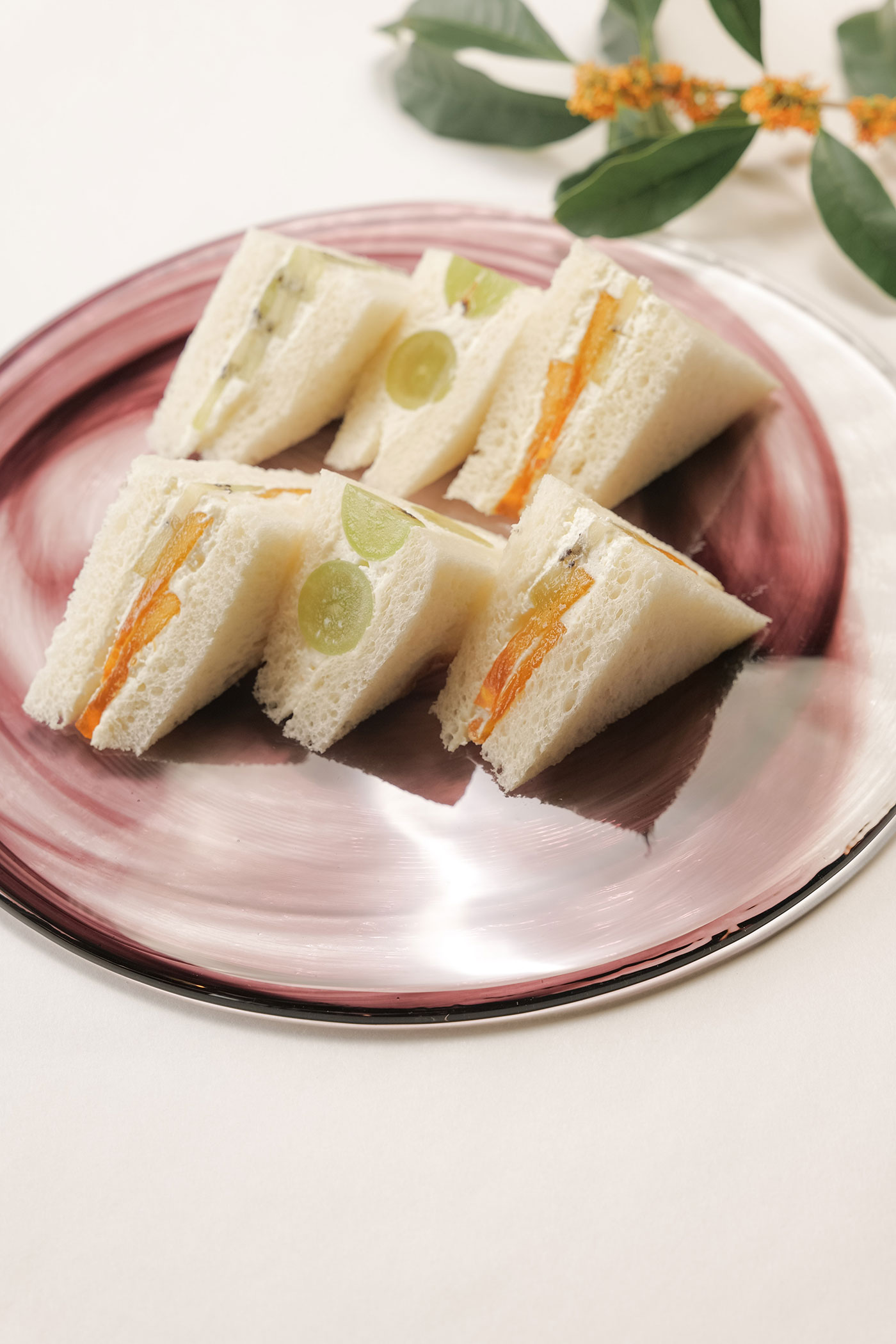 果実の実りが多いのも秋ならでは。柿や葡萄、キウイを贅沢に用いてフルーツサンドを作りました。小さなお子さまにも大人気。こちらも秋の風物詩のさつま芋と紫芋を2種類用いてクリームチーズを添えました。最後にまるで漆器のような金箔が付いたお椀〈かなざわ〉に、色が綺麗なざくろソースをかけた冷たいバニラアイスの大福を。