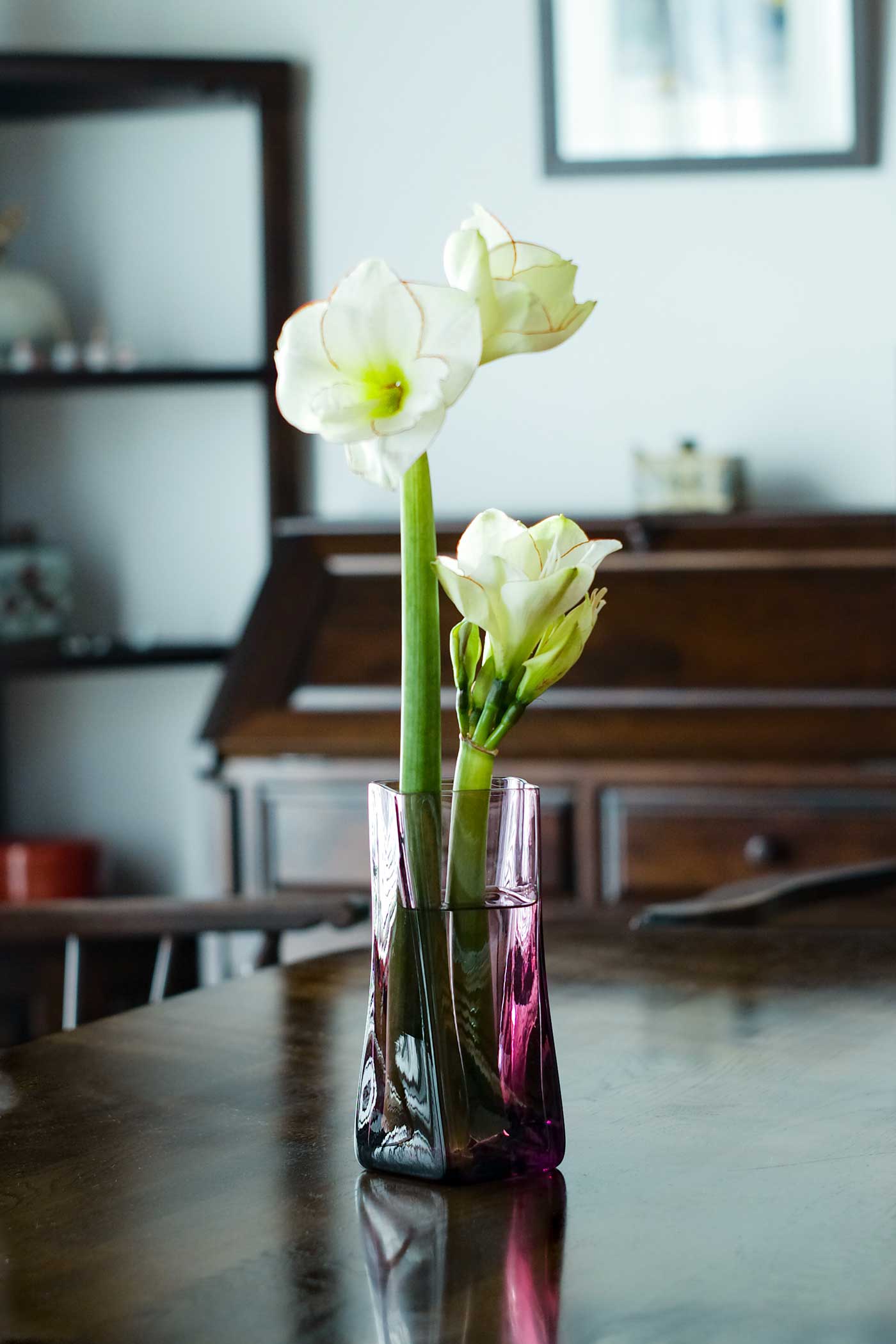 〈ヘレン 四角 S サイズ・ワインレッド〉は、ハンドメイドならではの絶妙なねじりが加わったフラワーベース。ねじれた箇所は花留めにもなります。また、底にガラスの厚みがある分、ワインレッドの色が濃くなっていくグラデーションも美しい製品です。「花器の曲線と光のゆらぎの美しさを引き立てるために、花はシンプルに。頭の大きいエレガントな花を一、二輪活けるだけでも素敵です。選んだのは、真っ白ではなく花器と同系色の縁取りの入ったアマリリス。茎のみずみずしい美しさまで楽しめるのがガラスの器のいいところです」(橘さん)