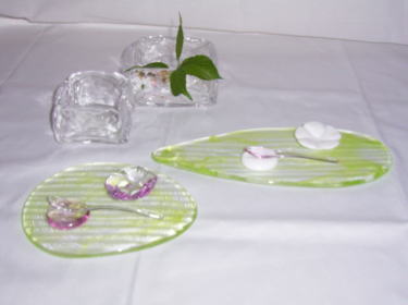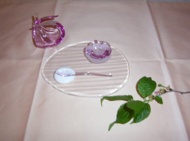 グリーンの中にやんわりと横たわるすりガラスのプレートが お料理やお菓子に春の息吹きを吹き込んでくれます。 商品番号:TTU-120W・90W(たたむ 鉢M/S) SAS-170GR・240GR(ささプレート丸・長) NC-85VO/H NC-84VO/H(お箸置き 花・丸) CS-11VO/W (ティスプーン) |