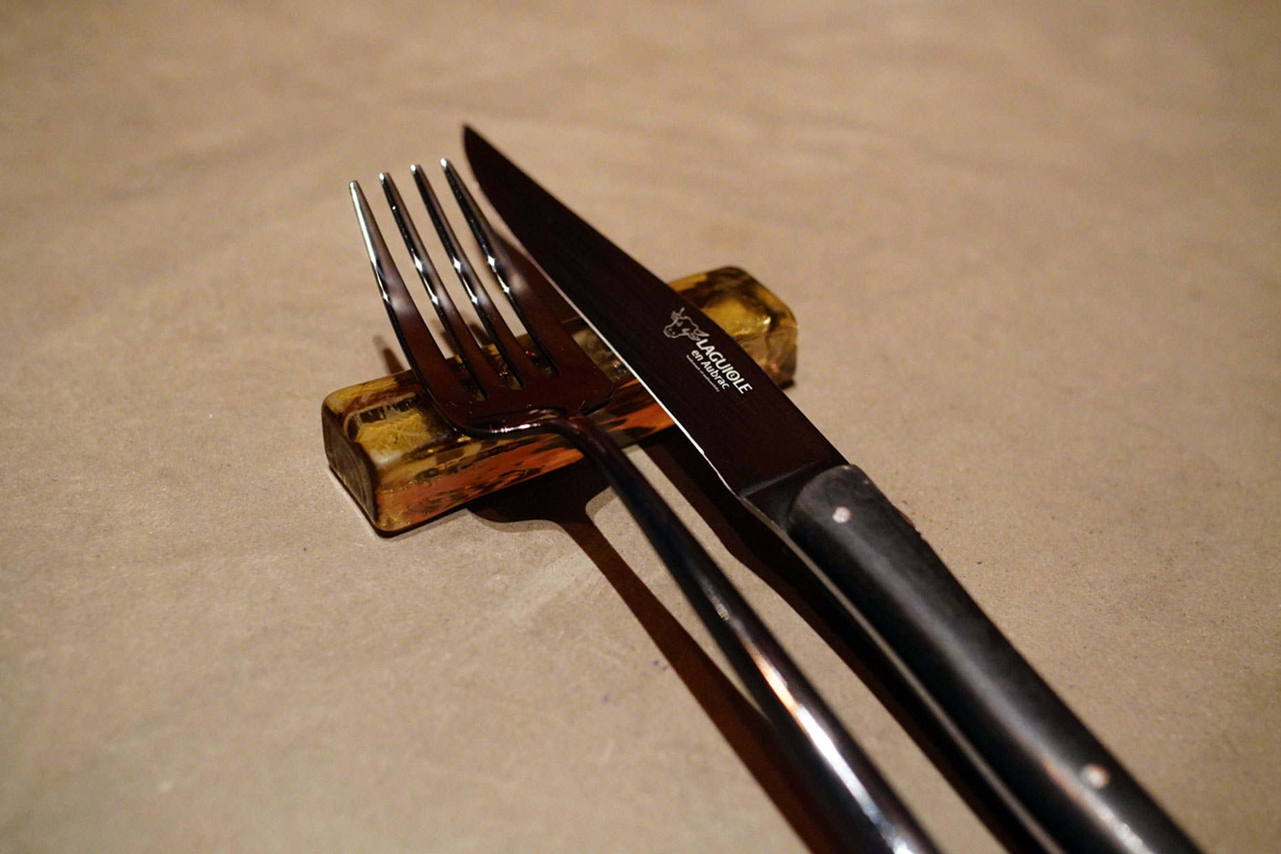 お肉用のラギオールナイフはタンカラーのレストにセットしていただきました。(KF-54T)