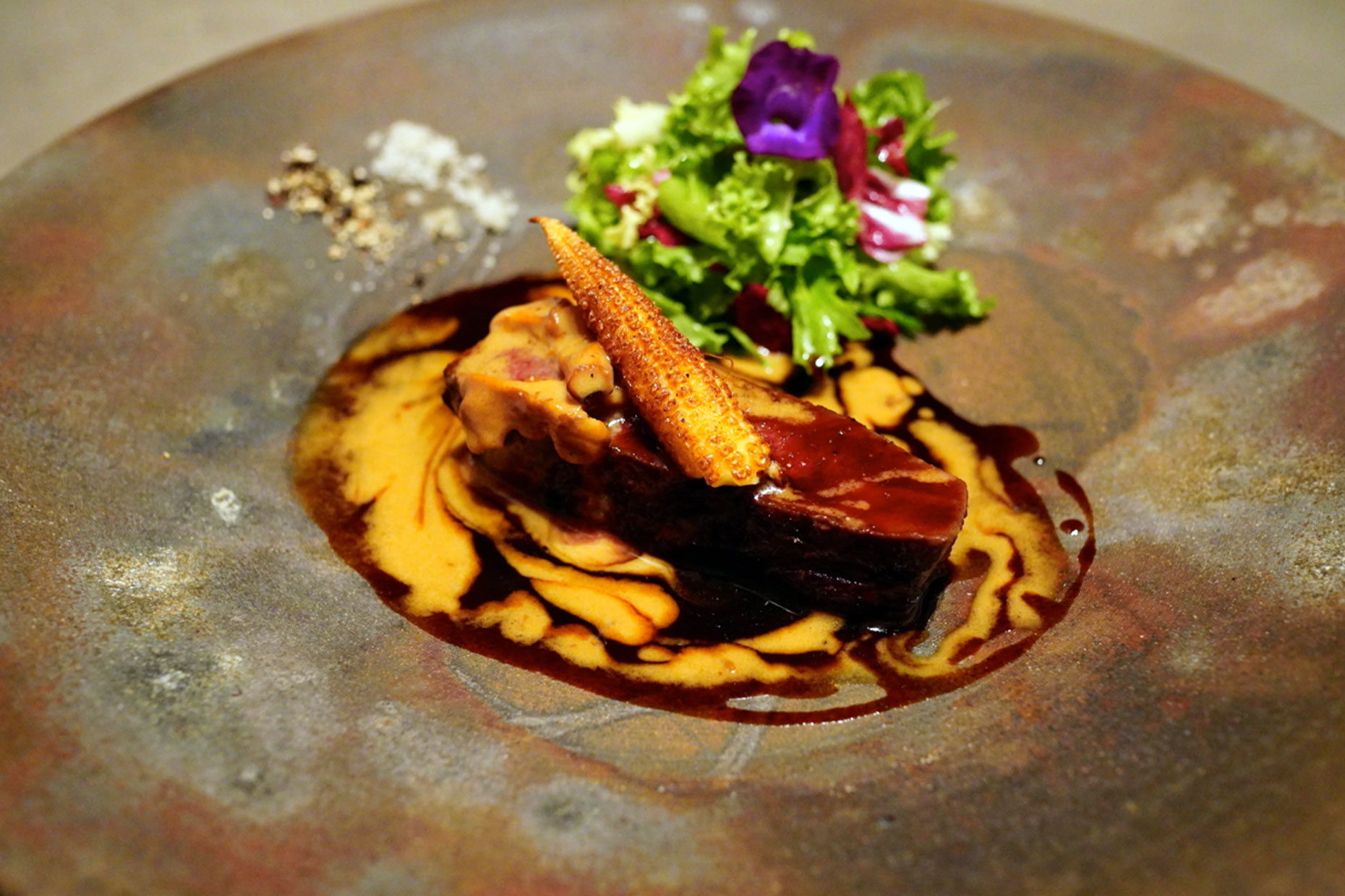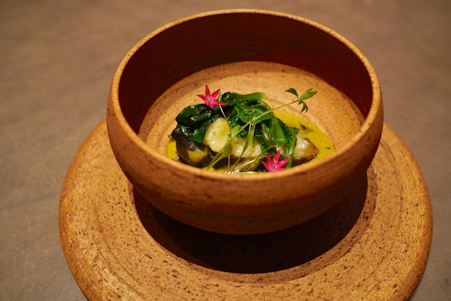 低温で6時間柔らかく火入れした蝦夷鮑には、お出汁と肝のオランデーズソース、ツルムラサキ、ペンタス、セロパセ、青柚子があしらわれて。