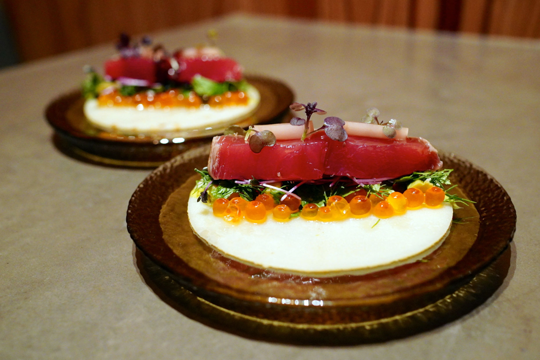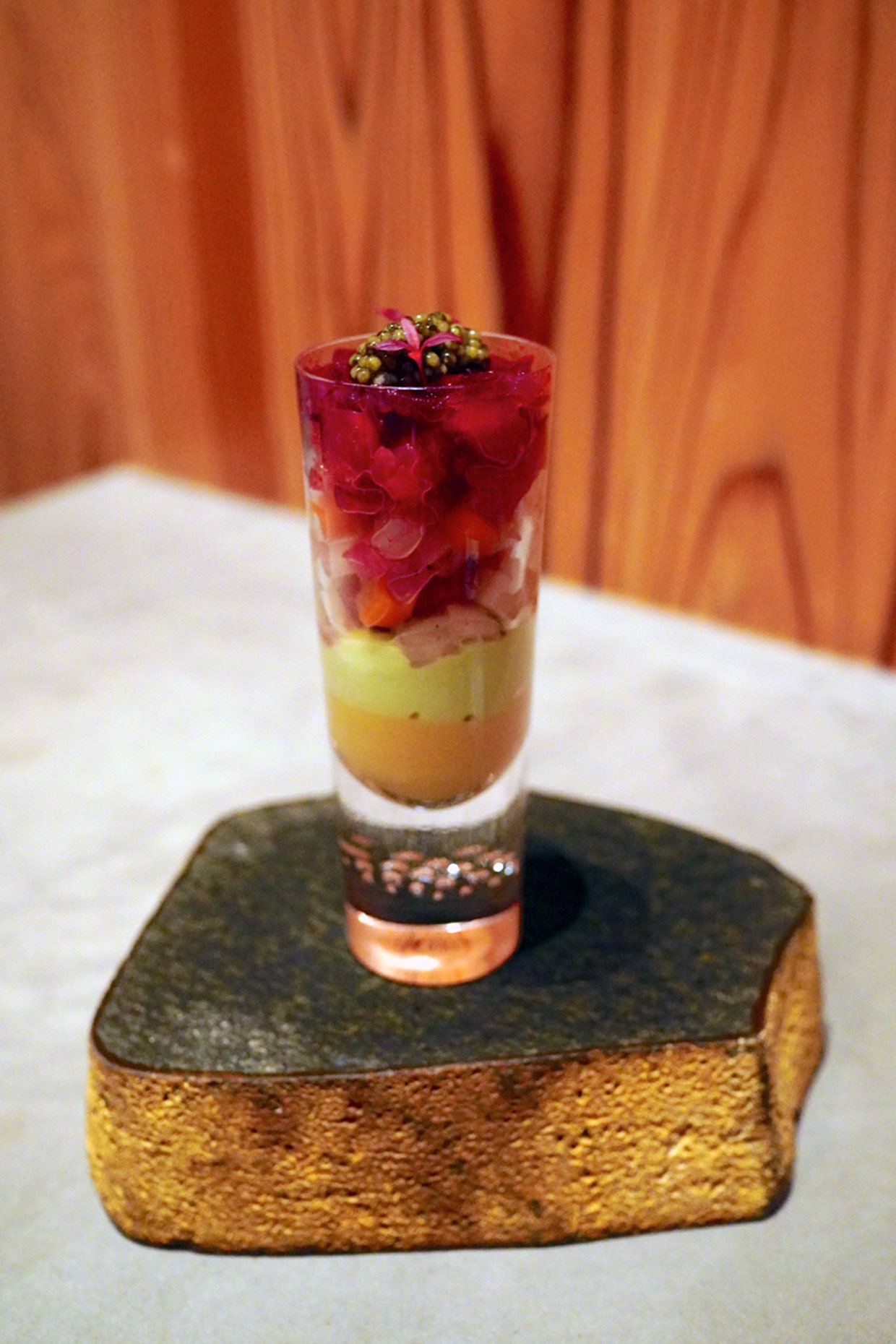 柑橘とゆずの苦味が爽やかなソース、枝豆のムース、本鮪、赤ワインビネガーでマリネしたビーツ等のお野菜が美しい層に!