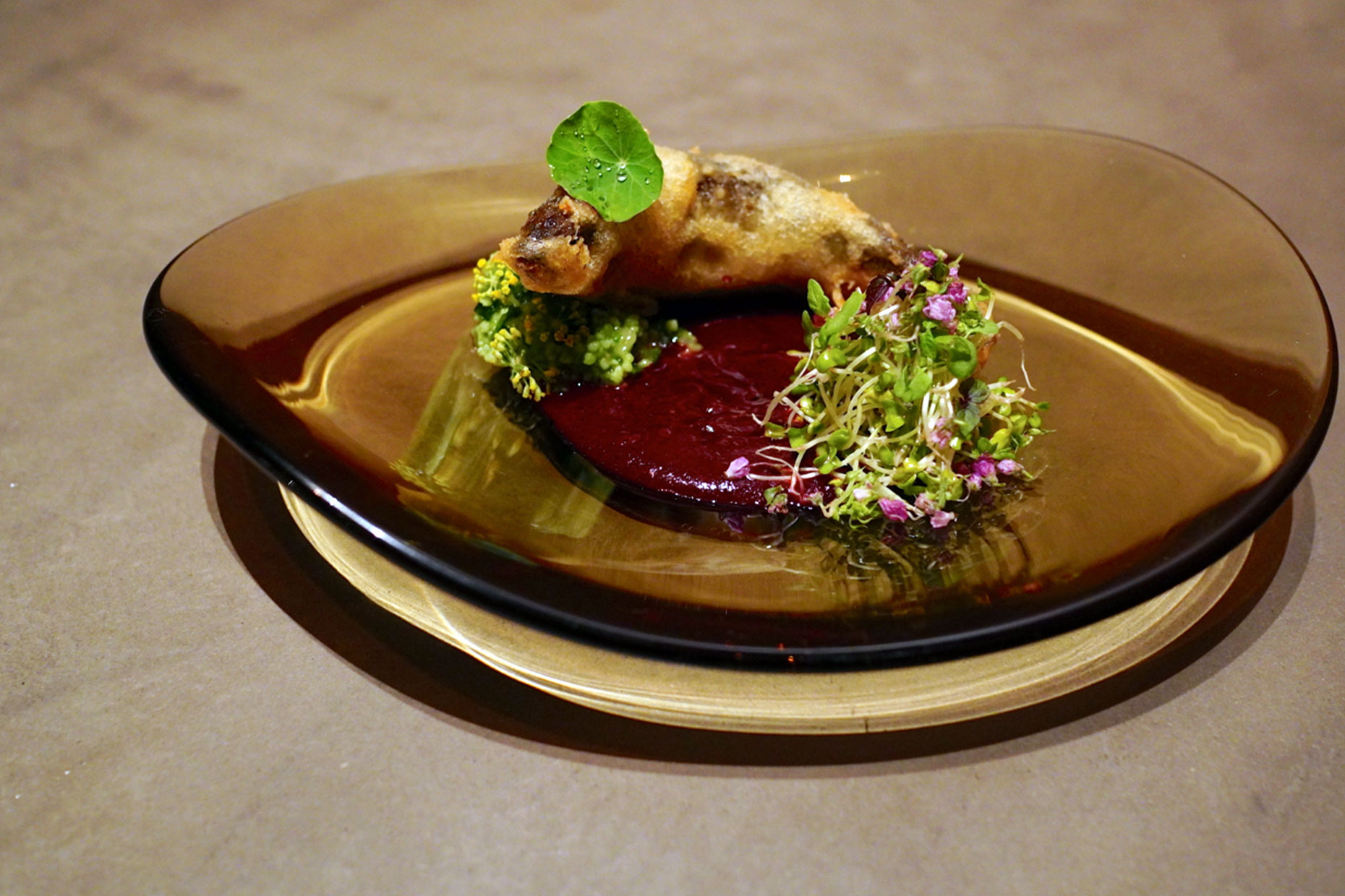 100℃で4時間火入れして頭や背びれも柔らかくコンフィされた若鮎のフリットを、紫蘇やビーツ、ビネガーのソースと様々なお野菜やフルーツ、ハーブを使った二種のサラダとともに。