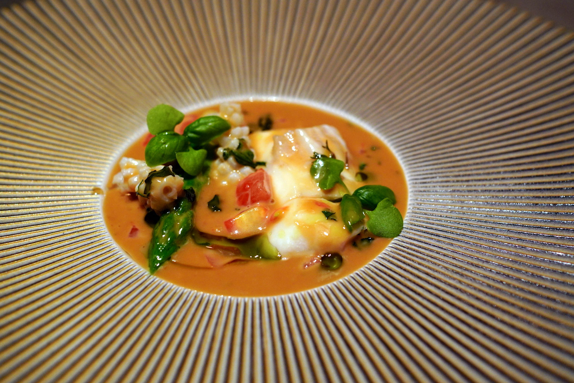 しっとりした平目と柔らかな白イカをトマトとバジル、アスパラとともに甘みとコクのディグレレソ―スで味わう一皿。