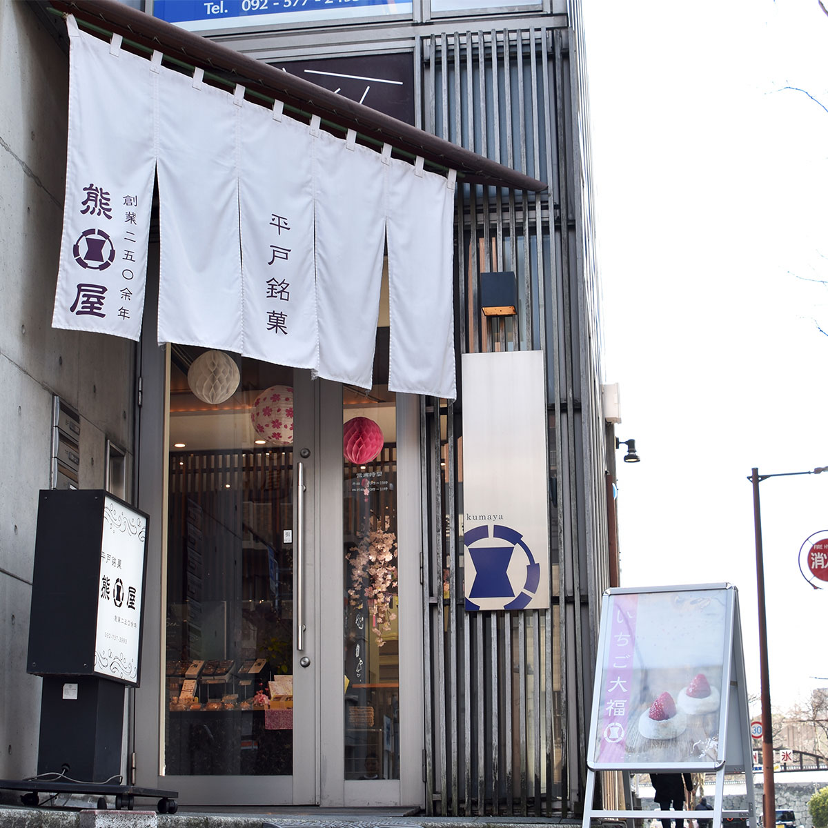 日本に初めて砂糖が伝わった地、平戸に本店を構える熊屋さん。福岡市中央区赤坂にある福岡店は黒を基調とした内装がとても素敵なお店です。