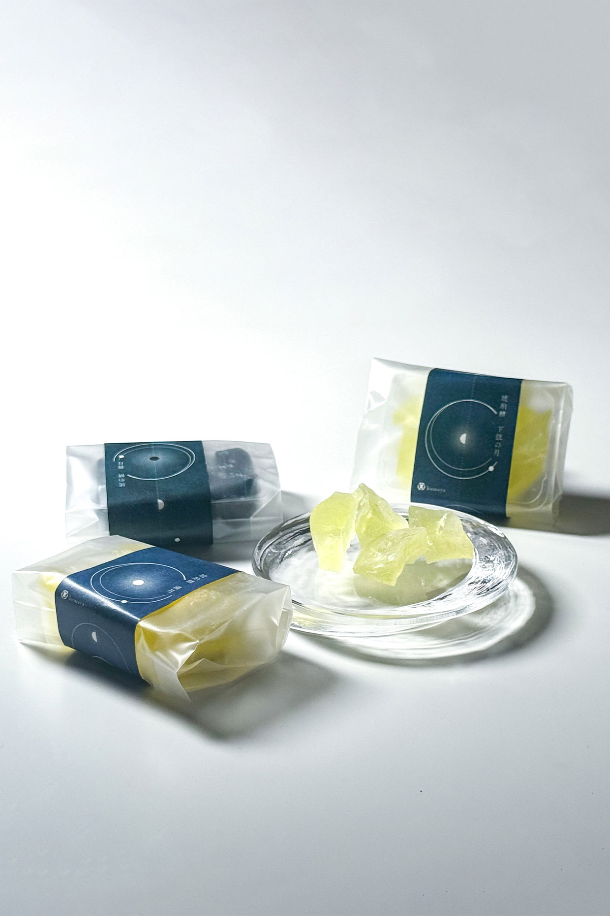 熊屋さんがセレクトした Sghr の「満ち欠け」は、月の姿をガラスで表現したプレート。その満ち欠けに合わせて考案された琥珀糖は、「新月」「満月」「下弦の月」と名付けられました。