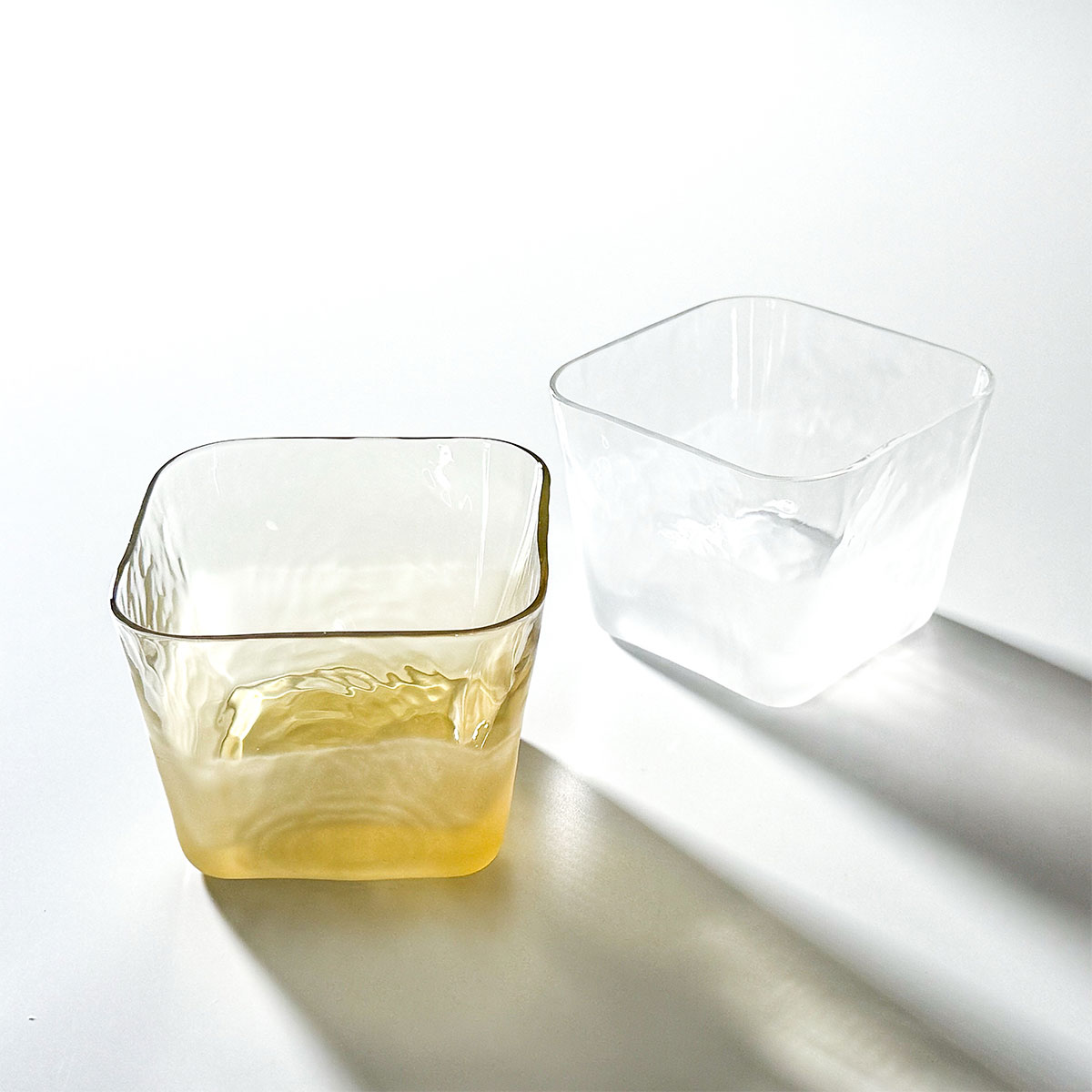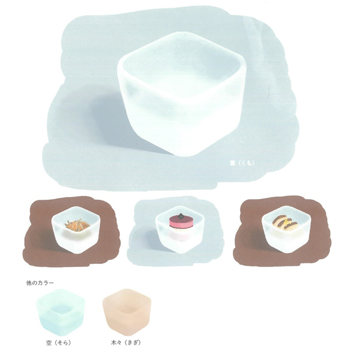 丸い器が多い食卓に心地よいリズムを生む四角い形状で、スタッキングできる実用性や、フロスト加工の切り替えのアクセントなど、細やかな配慮が組み合わされていて、ありそうでないバランス感。