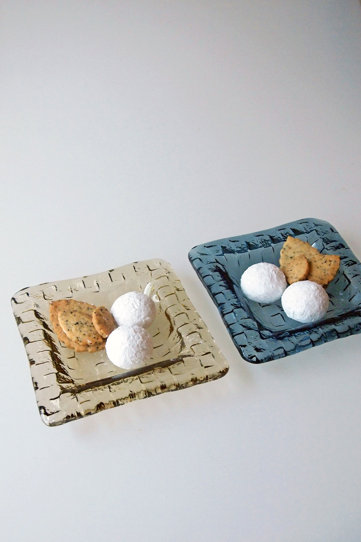 もう一つは、格子柄のスクエアプレート「グリッドプレート」のタン、インディゴブルーと、ピーナッツバタースノーボールとジンジャーティークッキーのセットです。