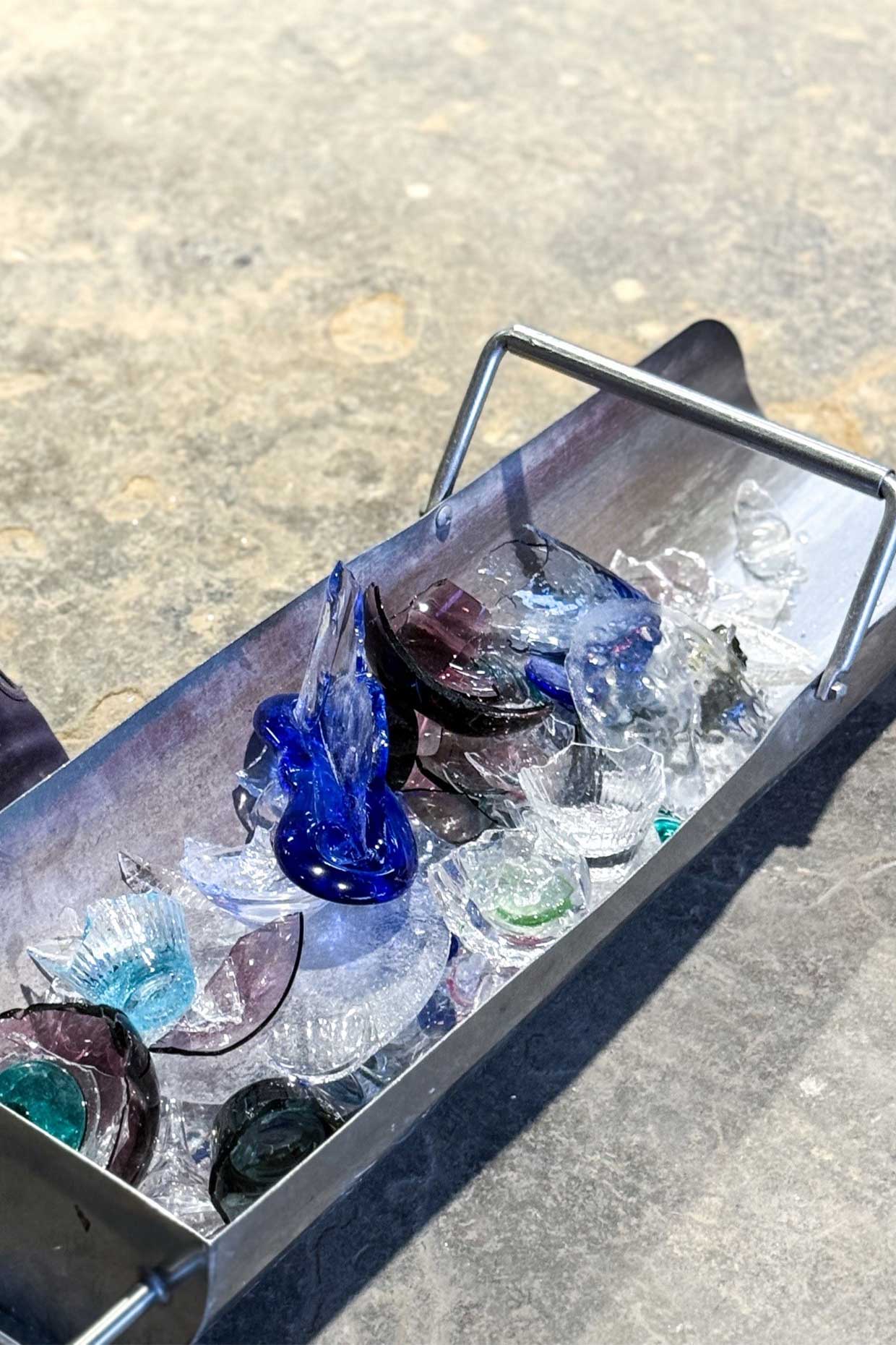 皆さまからお持ちよりいただいたガラスたちを溶けやすいように細かくし、投入する準備をします。
