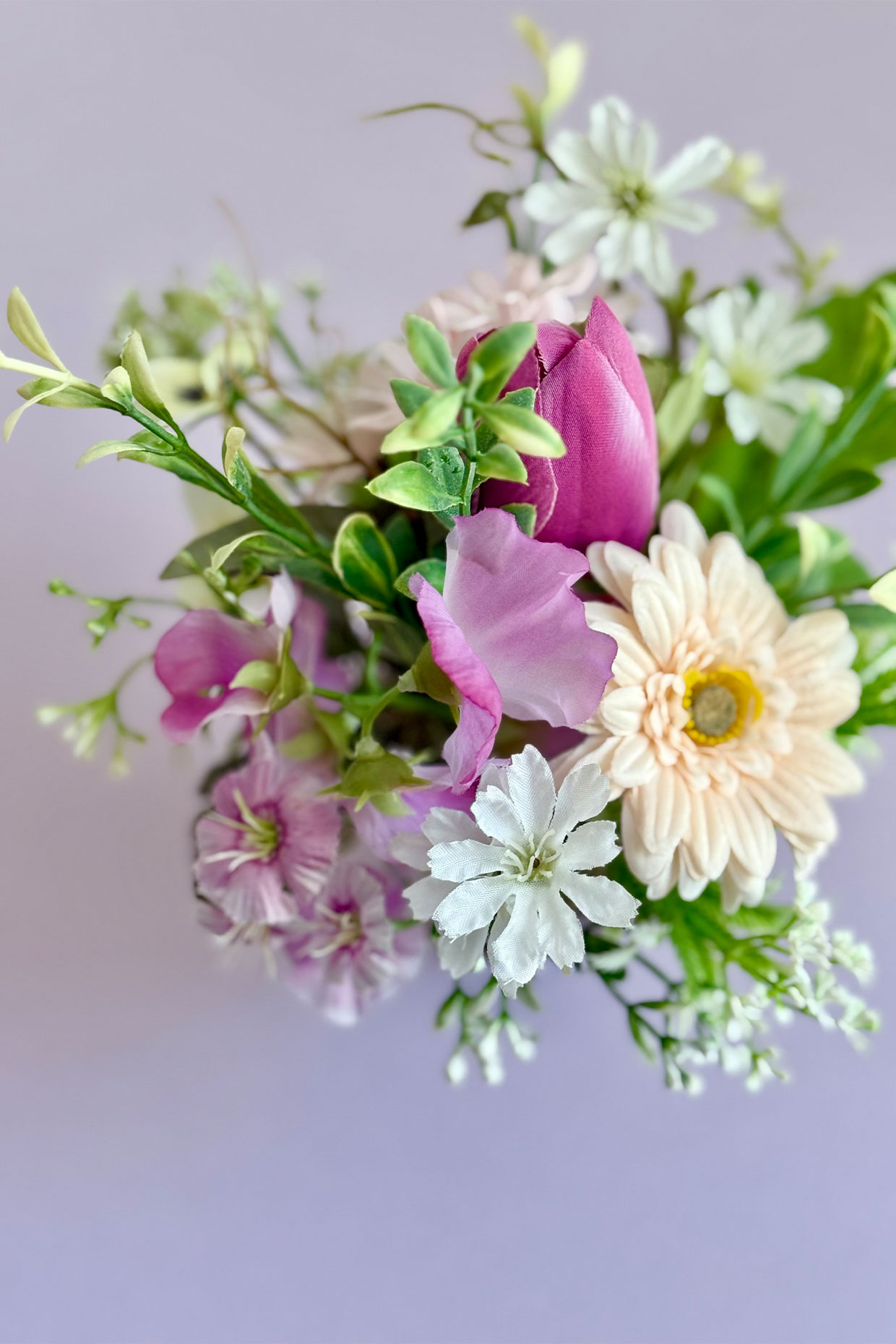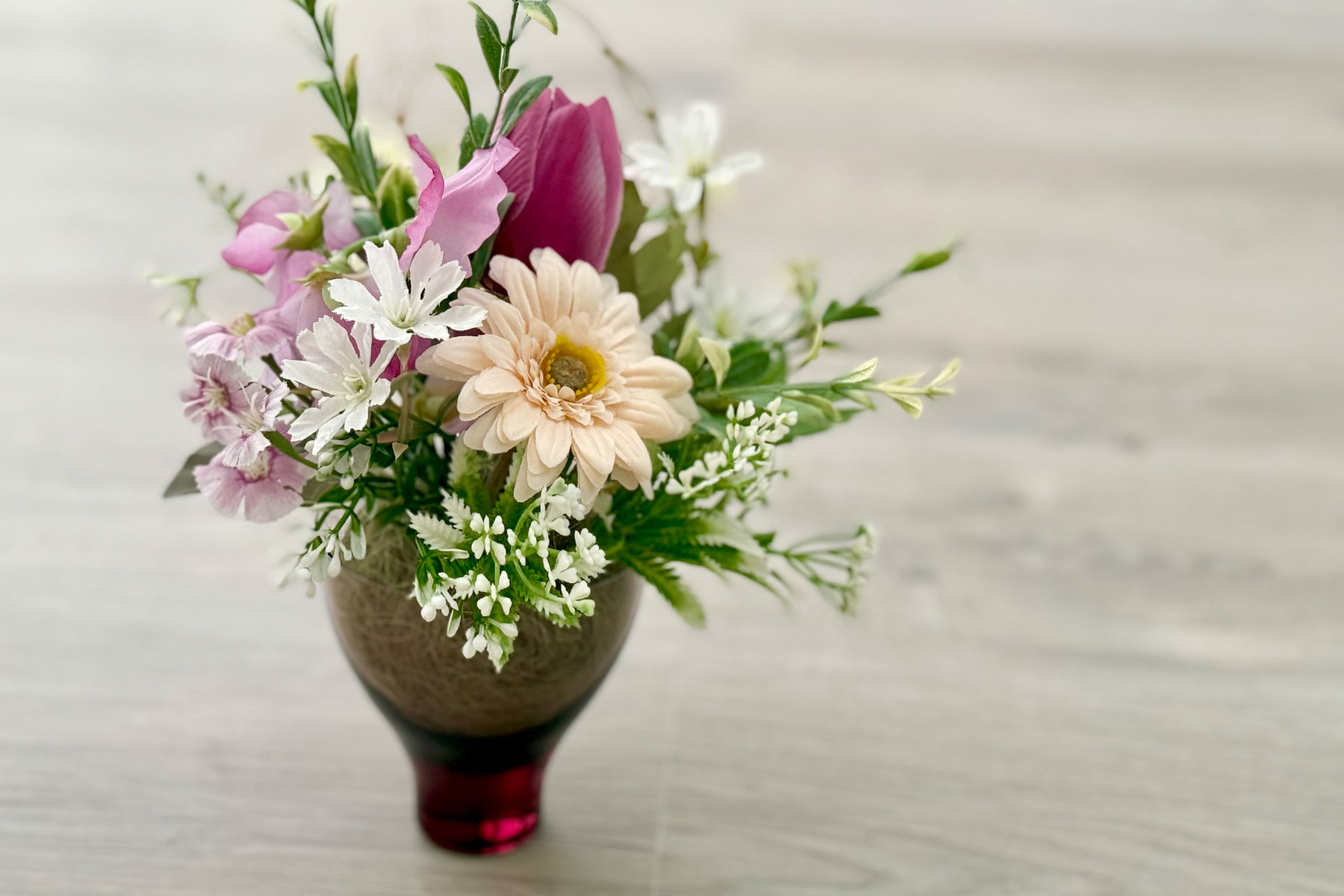 深みのある色合いが人気のワインレッドのリリオに、春の訪れを感じさせるやわらかな色合いのフラワーアレンジメントを作ってみませんか。チューリップやガーベラ、スイートピー、デージー、なでしこなど、春のお花をバランスよくあしらいました。可憐であたたかみのある表情が、空間にそっと彩りを添えてくれます。