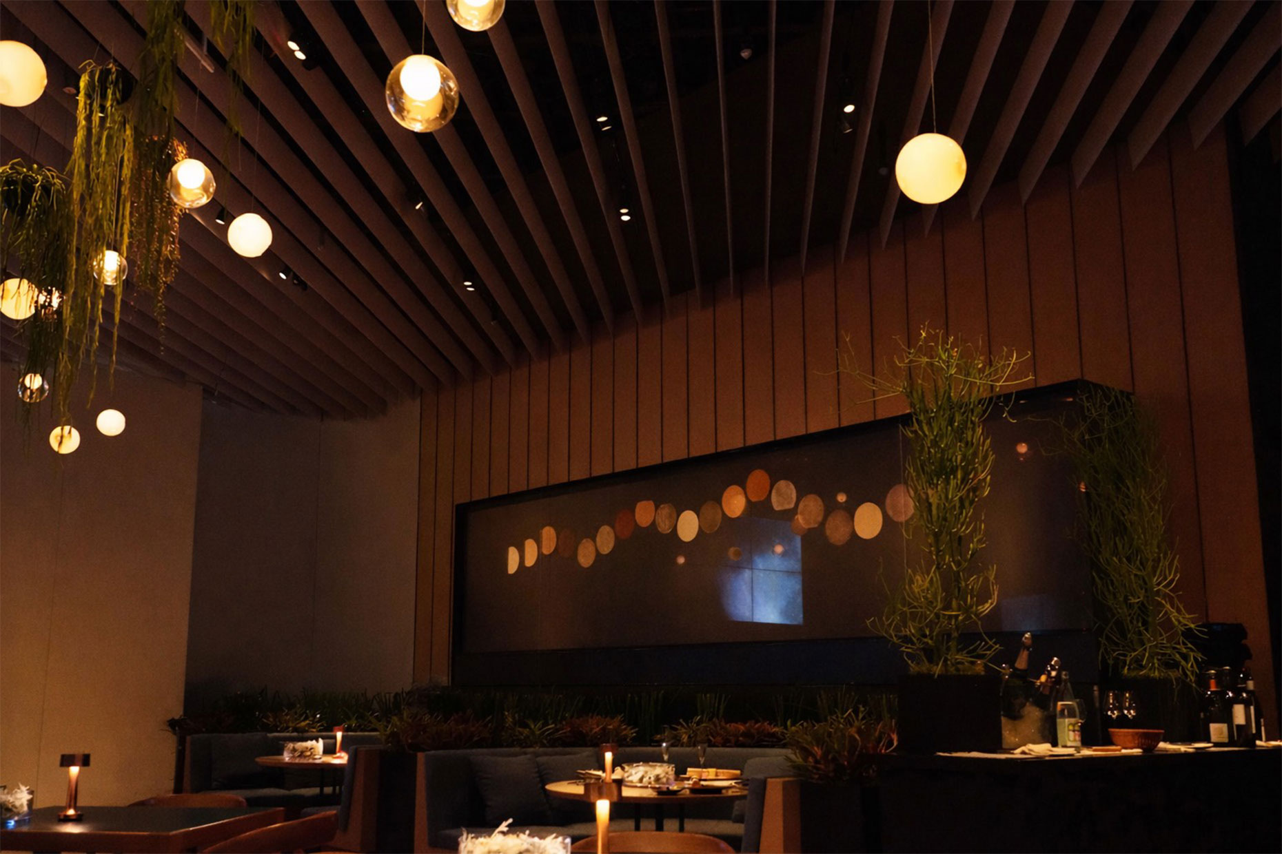 東京上空からの景色を一望に眺めることのできるロケーションに、さまざまな植物やアートがちりばめられた、〈天空の森〉をイメージしたレストラン「THE SUN&THE MOON Restaurant」。