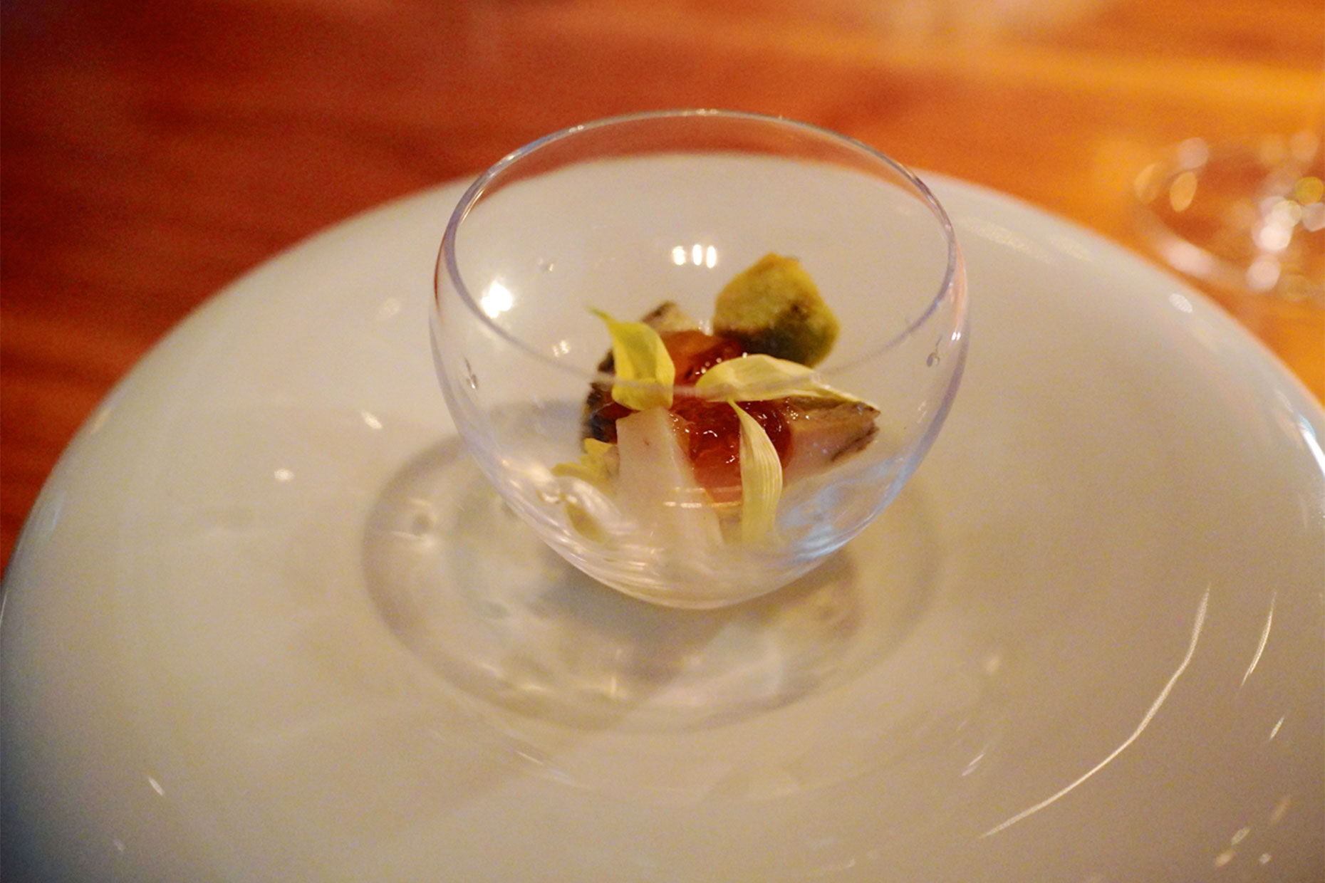 鮑の肝を使ったフランの上に、柔らかくコンフィした蝦夷鮑、コンソメのジュレ、アボカドのフリット、菊の花が添えられて。(ARC-75W)
