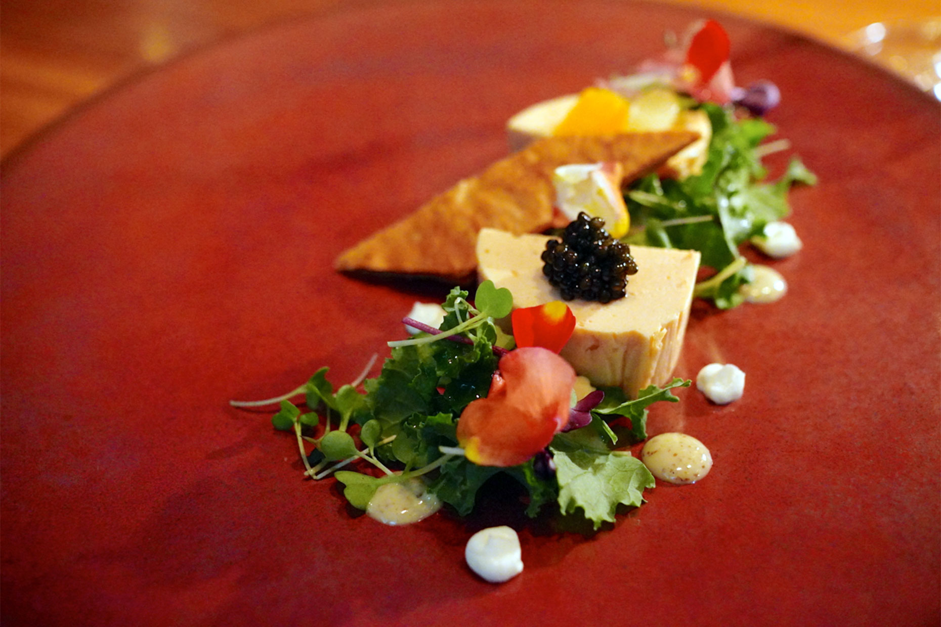 国産の鹿、鴨、豚のジビエのテリーヌをパンドカンパーニュとともに。コンフィしたフォアグラの上には、奈良の柿を使ったジャムが添えられて。