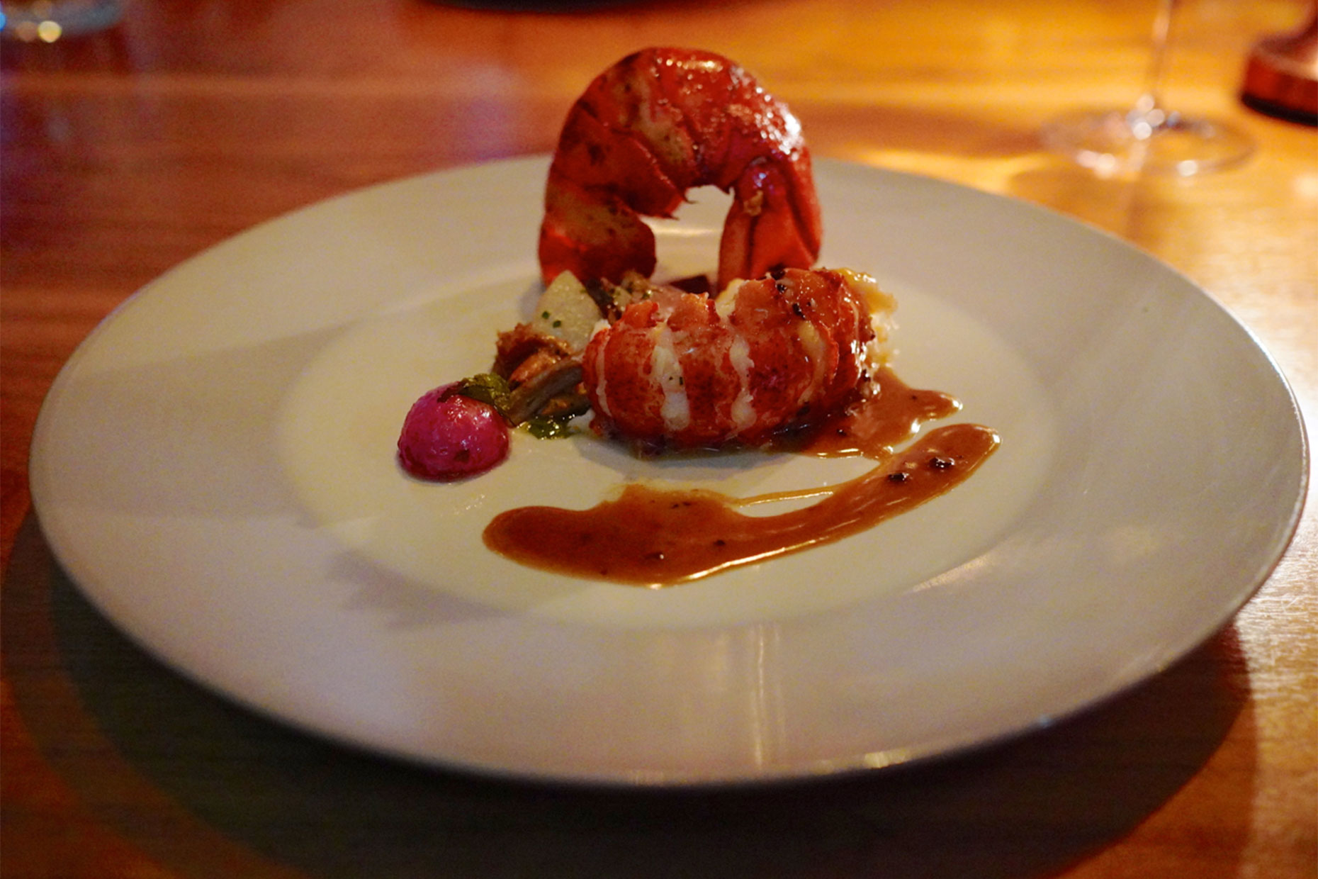 プリっと仕上げられたオマール海老を、付け合わせのラディッシュ、カブ、さまざまな茸とともに、トリュフとマッシュルームのクリームソースをからめながら味わいました。