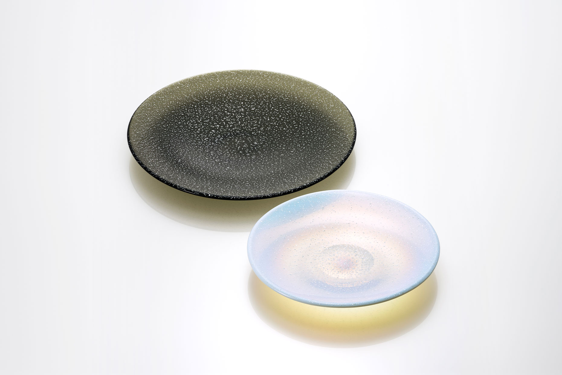 「琥輪」は、雲母という鉱物を使った、光の環をイメージしたキラキラとしたプレート。製品化となったオパールとカーボンブラックの2サイズのプレートが生まれるまでに試作された、サイズや色の違うプロトタイプ品は、今回ご用意するすべて、色や形や表情が異なりますので、全てが世界に1つだけのプレートです。