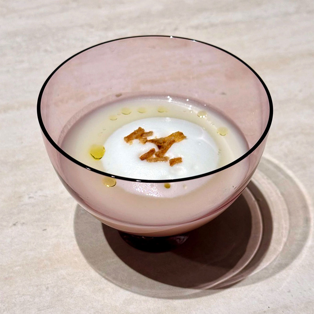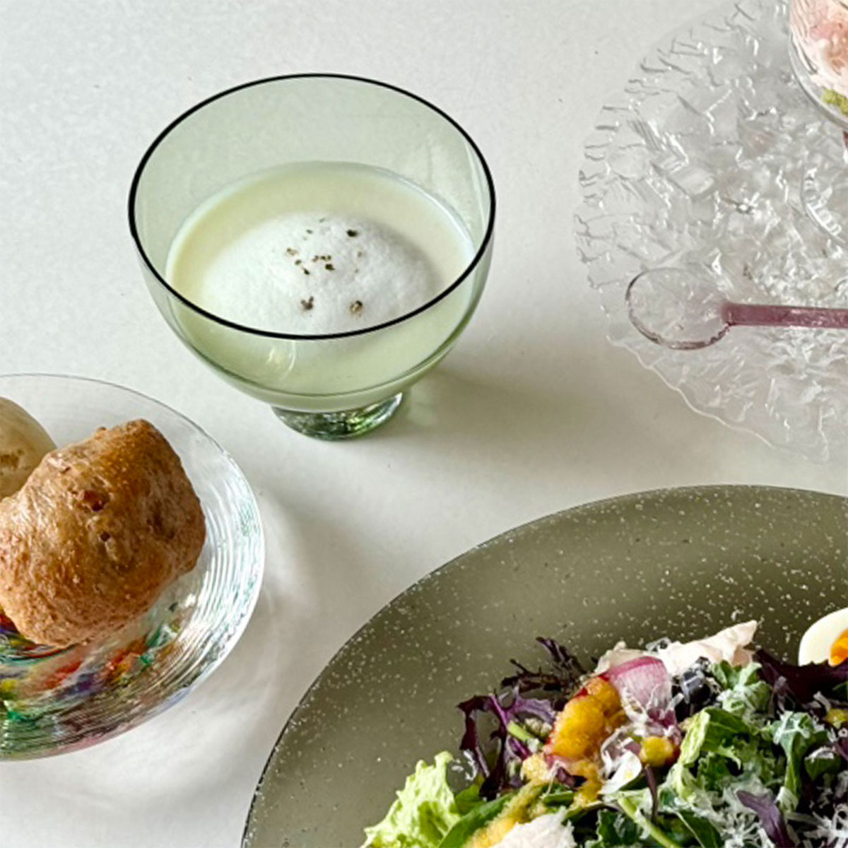 冷製スープのような淡い色のお料理がとてもよく映え、器とのコントラストが効いて、テーブルの上の彩りが華やかに!