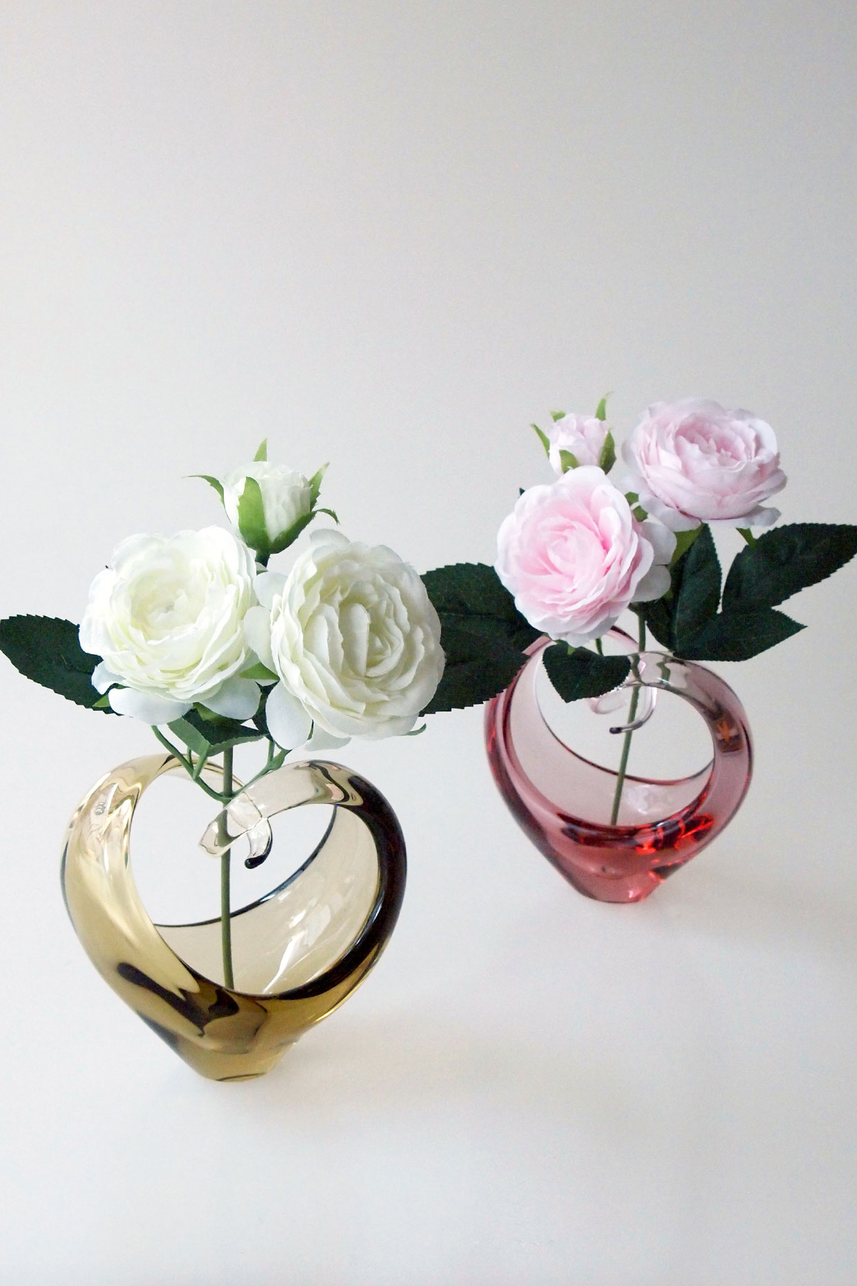 Sghr のアートフラワーとのギフトセットの定番、ハートの形をした「ハートクルヴァ」。淡い色合いが優しい印象のホワイトローズ、ピンクローズを組み合わせました。